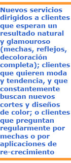 Nuevos servicios dirigidos a clientes que esperan un resultado natural y glamouroso (mechas, reflejos, decoloración completa); clientes que quieren moda y tendencia, y que constantemente buscan nuevos cortes y diseños de color; o clientes que preguntan regularmente por mechas o por aplicaciones de re-crecimiento.