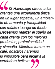 I.S.: IS Hairdesign ofrece a los clientes una experiencia única en un lugar especial, un ambiente de armonía y tranquilidad con música lounge de fondo. Deseamos realizar el sueño de cada cliente con los mejores productos, profesionalidad y simpatía. Mientras toman un café, nosotros haremos lo imposible para llegar a la verdadera belleza.