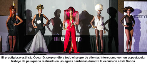 Junto al equipo Intercosmo viajó el prestigioso estilista Óscar Guinea (director y propietario de Óscar G), quién sorprendió a todo el grupo de clientes Intercosmo con un espectacular trabajo de peluquería realizado en las aguas caribeñas durante la excursión a Isla Saona. Además, amenizó una de las tardes en Punta Cana ofreciendo una interesante charla motivacional a todos aquellos que quisieron asistir. Y como colofón, realizó una exhibición de sus últimas creaciones en la cena de gala que sirvió de cierre del viaje.