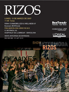 El día 12 de marzo a las 11:30 h., en la Feria Cosmobelleza de Barcelona (Fira Barcelona Gran Vía M-2) se celebrará la gala Intermoda Rizos primavera/verano 2007, donde se presentarán las nuevas tendencias de peluquería y en la cual actuarán más de 30 modelos y 20 profesionales de la firma que avanzarán la nueva colección primavera/verano "REMIXES" de Rizos.El vestuario correrá a cargo de marcas tan prestigiosas como: D&G, GFF FERRÉ, DSQUARED 2, MAC Q, AMULEI J, JUST CAVALLI, MARIELLA BURANI y FRANKIE MORELLO.