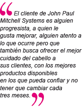 J.P.D.: El cliente de John Paul Mitchell Systems® es alguien progresista, a quien le gusta mejorar, alguien atento a lo que ocurre, pero que también busca cómo cuidar su cabello con los mejores productos disponibles en los que pueda confiar y no tener que cambiar cada tres meses. Los productos de Paul Mitchell® los usas el primer día y cinco meses después, diez años después perduran en el tiempo y funcionan exactamente igual, y con muchos otros productos no ocurre lo mismo.