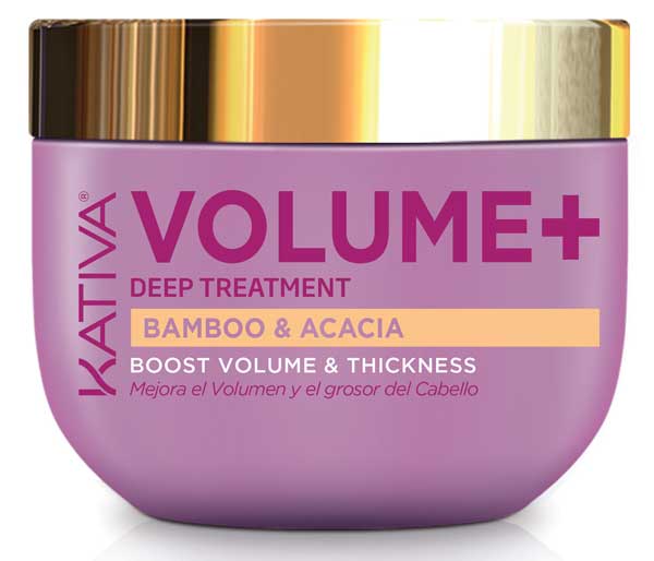 Kativa Volume+ que aporta cuerpo, densidad y flexibilidad al cabello fino. Está pensado para personas que tienen una melena excesivamente lacia, poco favorecedora y sin vida. Gracias a sus ingredientes naturales, se consigue un cabello con cuerpo y forma, junto con un aporte extra de hidratación y nutrición.