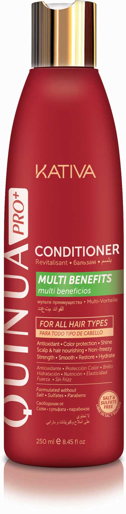 La fórmula Quinua PRO+, desarrollada por Kativa, está libre de sulfatos, sales y parabenos. Con su uso, se obtienen beneficios como: