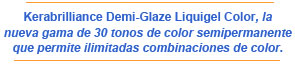 En esta ocasión la compañía presenta Kerabrilliance Demi-Glaze Liquigel Color, la nueva gama de 30 tonos de color semipermanente que permite ilimitadas combinaciones de color con unos resultados brillantes y luminosos.