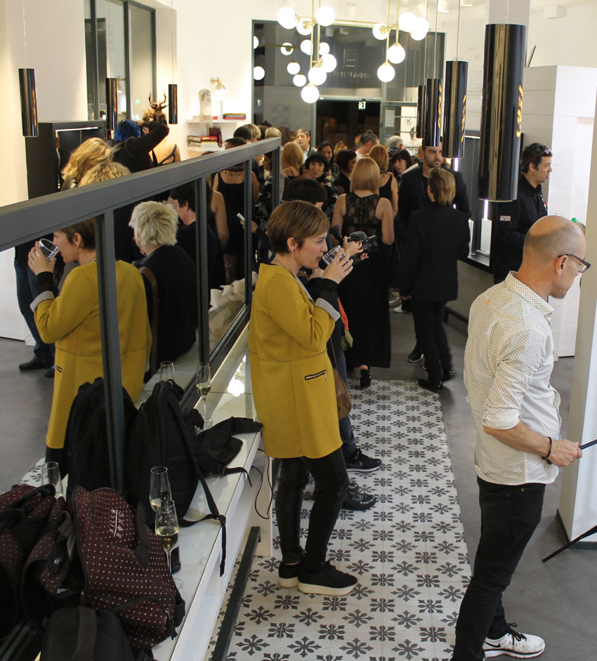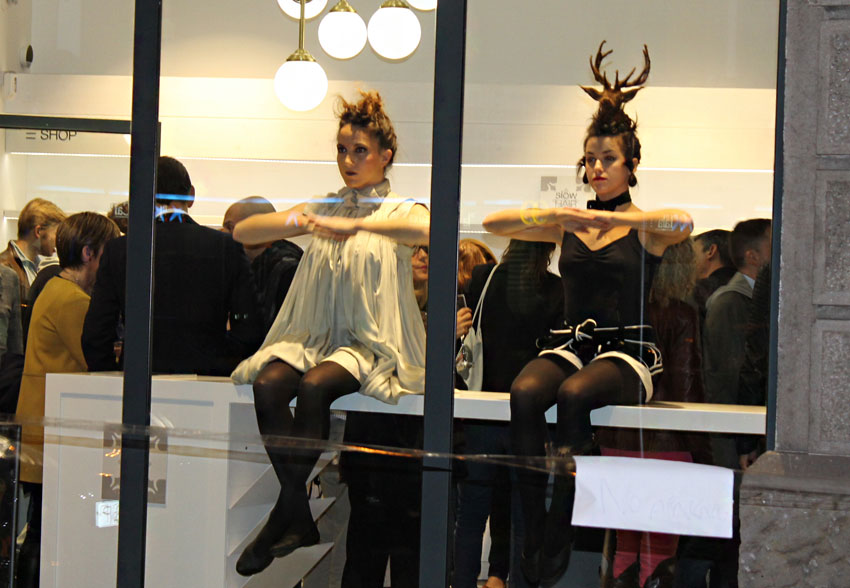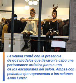 Más de 150 invitados, entre estilistas como el emblemático Marcel Montlleó, famosos como la actriz Mariona Ribas y miembros de la prensa especializada, por citar algunos, se acercaron a la nueva peluquería Anna Ferrer. La velada contó con la presencia de dos modelos que llevaron a cabo una performance artística junto a uno de los escaparates del salón. Una de las modelos lucía uno de los tocados que más ha posicionado a los salones Anna Ferrer a nivel internacional. Se trata de una cabeza de ciervo a base de cabello natural de una colección elaborada para la firma Wella. La otra modelo llevaba un peinado más actual, inspirado en una colección inspirada en los nómadas. Ambas modelos pretendían transportar a los presentes a "un mundo imaginario", en opinión de Ferrer.