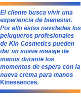 Los rituales en los salones de peluquería cada vez van más allá ya que el cliente busca vivir una experiencia de bienestar. Por eso, Kin Cosmetics anima a los profesionales a dar un suave masaje de manos durante los momentos de espera que el cliente tiene en el salón. Ya sea mientras sube el tinte o se está realizando un tratamiento en el lavacabezas. Cualquier momento es bueno para sorprender al cliente y ofrecerle un servicio con valor añadido.