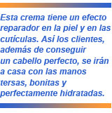 Además se trata de un producto respetuoso con nosotros y con el medioambiente porque no contiene aceites minerales, parabenos, silicionas, liberadores del formaldehido, y su envase es 100% reciclable. Tras la visita al salón, el cliente no solo se irá a casa con el cabello perfecto, también se irá con las manos tersas, bonitas y perfectamente hidratadas.