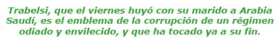 Primero fue amante del actual ex presidente de Túnez, Abidine Ben Ali. Más tarde pasó a ser su segunda esposa, llegando a ser así la primera dama del país. Leila Trabelsi es "la regenta" de Túnez. O "la reina" del Magreb. O "la emperadora" de Cartago. Ella ronda los 40 y antes de conocer a su marido (Ben Ali era entonces jefe de la seguridad nacional, allá por los años ochenta del pasado siglo), había sido vendedora ambulante y peluquera. Pero, sobre todo, Trabelsi, que el viernes huyó con su marido a Arabia Saudí, es el emblema de la corrupción de un régimen odiado y envilecido, y que ha tocado ya a su fin.