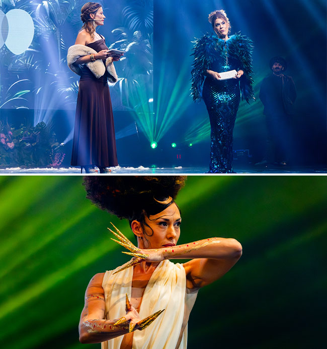 Cada intervención estuvo acompañada de una puesta en escena cuidada, con proyecciones inmersivas, música y un trabajo de peluquería que se integró dentro del relato como lenguaje artístico.