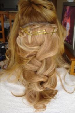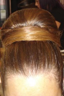 luego hice las particiones y coloque unas tiras de cabello para crear mas espesor en el recogido, en la foto se ve diferencia de color, y aunque era muy liguera la diferencia,lo importante era que al final no se notaba nada, bueno, eso creo,no?