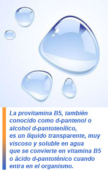 La provitamina B5, también conocido como d-pantenol o alcohol d-pantotenílico, es un líquido transparente, muy viscoso y soluble en agua que se convierte en vitamina B5 o ácido d-pantoténico cuando entra en el organismo.
