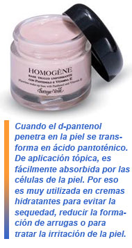 Mientras en el cabello el d-pantenol permanece en su forma provitamina, cuando penetra en la piel se transforma en ácido pantoténico. De aplicación tópica, es fácilmente absorbida por las células de la piel. Por eso es muy utilizada en cremas hidratantes para evitar la sequedad, reducir la formación de arrugas o para tratar la irritación de la piel.
