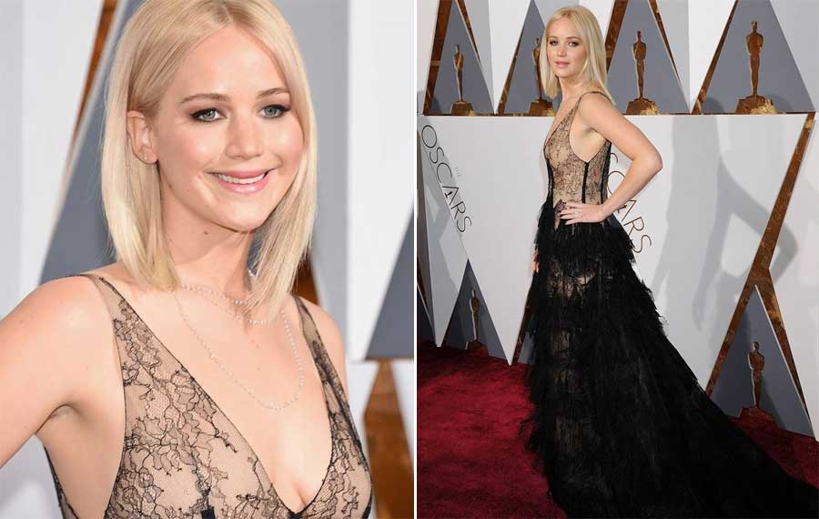"La clave de este look es un corte perfecto", asegura Eduardo Sánchez. El lob de Lawrence queda justo a la altura de la clavícula. "De esta forma, no llega a caer sobre los hombros, sino que alarga la línea visual del cuello y actúa casi como una prolongación del escote". Es un lob ligeramente desfilado y de aspecto pulido, joven y fresco, el contrapunto perfecto de su vestido, en opinión del estilista.