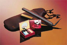 La styler venía acompañada de una funda térmica resistente al calor en negro brillante y del estuche “Justine Case” de Benefit Cosmetics (incluye miniaturas del brillo de labios “California Kissin", de la sombra de ojos “Eyecon”, de la base de maquillaje “Some Kind-agorgeous” y del pintalabios y colorete “Benetint”).