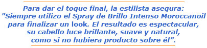 Para dar el toque final, la estilista asegura: "Siempre utilizo el Spray de Brillo Intenso Moroccanoil para finalizar un look. El resultado es espectacular, su cabello luce brillante, suave y natural, como si no hubiera producto sobre él".
