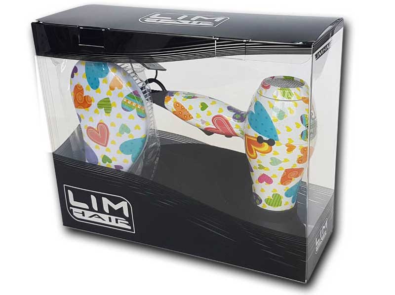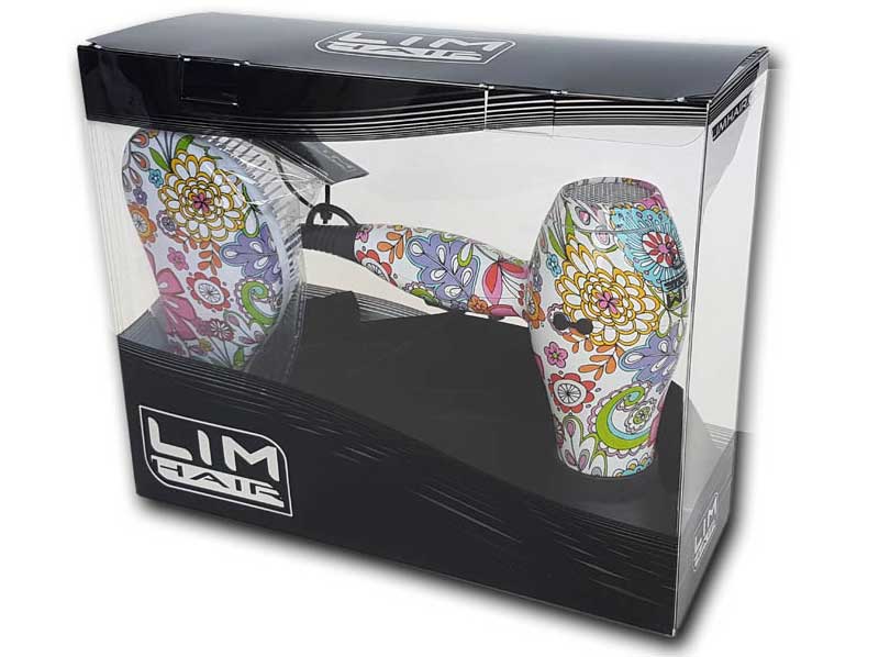 Ambos productos, secador y cepillo de Lim Hair se presentan en el mismo estampado, disponible en dos seductoras opciones, a cada cual más espectacular, alegre y divertida: Flowers y Cuore. Además, este bonito y práctico pack incluye también bolsa para el secador y como es habitual, boquilla y minidifusor.