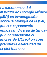 La experiencia del IMB en investigación sobre la biología de la piel, junto a la población étnica tan diversa de Singapur, complementa el interés de L'Oréal en comprender la diversidad de la piel humana. En 2010 ya se trabajó en este acuerdo, a través de una primera asociación con el IMB para reconstruir la piel asiática a partir de cultivos celulares. Después de unos resultados muy esperanzadores, L'Oréal Research & Innovation (R&I) decidió abrir un Centro de Investigación Avanzada en Biopolis, donde actualmente trabajan ocho científicos.