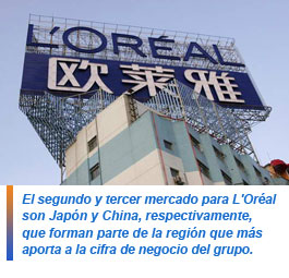 El segundo y tercer mercado para L'Oréal son Japón y China, respectivamente, que forman parte de la región que más aporta a la cifra de negocio del grupo. En Asia, la compañía factura el 35% de sus ventas globales. Cerrando la primera parte del Top 10 de mercados mundiales de L'Oréal están dos de los países conocidos como BRIC. Brasil y Rusia han escalado posiciones y cada vez copan un mayor porcentaje de las ventas del grupo.