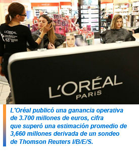 L'Oréal publicó una ganancia operativa de 3.700 millones de euros, cifra que superó una estimación promedio de 3.660 millones derivada de un sondeo de Thomson Reuters I/B/E/S.