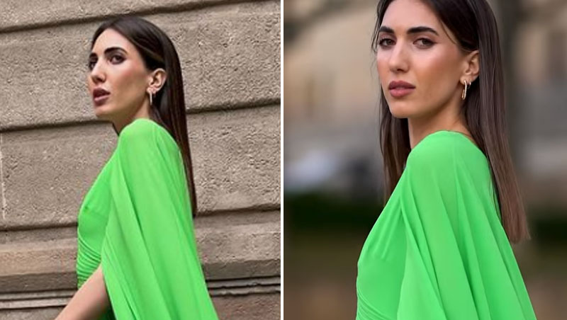 Se trata de un look se combina a la perfección con el vestido largo de corte clásico que lleva Abril. Las ondas desenfadadas de su pelo dan un toque informal que contrasta con la elegancia del outfit para crear un efecto más fresco y juvenil.