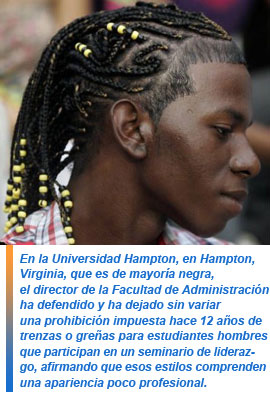 En la Universidad Hampton, en Hampton, Virginia, que es de mayoría negra, el director de la Facultad de Administración ha defendido y ha dejado sin variar una prohibición impuesta hace 12 años de trenzas o greñas para estudiantes hombres que participan en un seminario de liderazgo, afirmando que esos estilos comprenden una apariencia poco profesional.