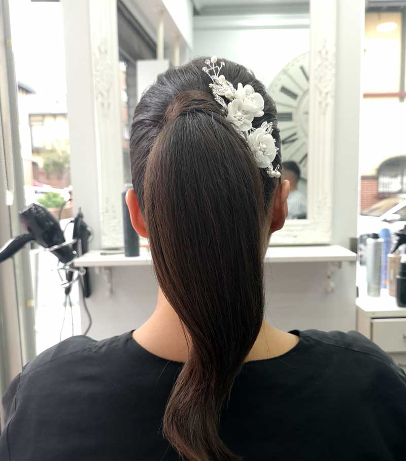 La coleta media o baja va a tener un gran protagonismo estas fiestas. Saiz recomienda llevarla con raya al medio o al lado, y la goma cubierta con un mechón. El toque sofisticado se le puede dar con algún complemento de pedrería o abalorio. El efecto wet hacia atrás con mucha gomina, es uno de los preferidos de la peluquera cántabra, junto con un recogido bajo a base de ondas al agua.