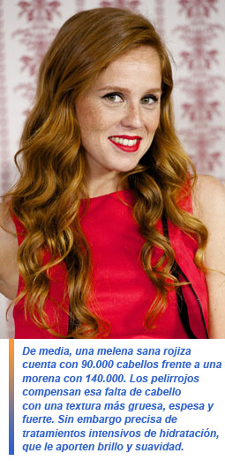 De media, una melena sana rojiza cuenta con 90.000 cabellos, frente a una morena con 140.000 o una rubia con 110.000. Sin embargo, los pelirrojos compensan esa falta de cabello con una textura más gruesa, espesa y fuerte. Por lo tanto, parece que tengan más cabello que el resto. "Una melena más escasa y espesa es más fácil de moldear. Ese es uno de los puntos fuertes de los pelirrojos", explica Alma Luzón.
