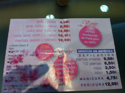 EXACTOOOOO !!! Pelucas lo a plasmado muy bien .."LOW COST" engloba muchos precios por debajo de la media no unos en concreto ,, como el a dicho el malentendido a sido que pueda ser que alguien interpreto precios como este ... La Firma que menciono tiene el Brushig a 7´25.corte.7´25 .. Color 12 es decir que se juega con la percepcion de la mente .. la clienta ve que se lo hace todo por 25 euros y no ve que son 26´50 ,, solo ve que no llega ni se aproxima a los 30 ..luego los acaba pagando porque la aplicacion de cada producto excepto shampoo neutro y acondicionador se paga a 1 euro y mascarillas o tratamientos 2´50 .. todo el mundo debe acabar palmando algun euros mas sobre su servicio solicitado inicial... Si te limitas a hacer lo que te pide la clienta logicamente te quedas en poco,,,Eso ya es la habilidad comercial que require el profesional aparte de creatividad y "manos" ...