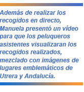 Además de realizar los recogidos en directo, Manuela presentó un vídeo donde se muestran los mismos, realizado por el fotógrafo Eduardo Trelles, con imágenes de Andalucía y con secuencias en los salones nobles del Ayuntamiento de Utrera y en el Niño Perdido, para que además de que los peluqueros asistentes visualicen los recogidos realizados, vean también imágenes de lugares emblemáticos de Utrera y Andalucía, ya que Manuela lleva muy a gala por donde va el hecho de que es utrerana y andaluza.