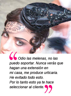 M.M.: Mis colegas me llamaban el enfant terrible de la peluquería y quizás ahora haga reír, sobre todo por mi edad (sonrisa de niño malo). Lo cierto es que tengo muy "buen rollo" con todos los colegas, he hecho siempre lo que he querido, me he permitido el lujo de seleccionar mi clientela por su propio gusto, y no por nivel económico ni social. Odio las melenas, no las puedo soportar. Nunca verás que hagan una extensión en mi casa, me produce urticaria. He evitado todo esto. Por lo tanto esto ya te hace seleccionar al cliente.