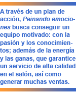 A través de un plan de acción, Peinando emociones busca conseguir un equipo motivado: con la pasión y los conocimientos; además de la energía y las ganas, que garantice un servicio de alta calidad en el salón, así como generar muchas ventas. "Lo que busco con este programa es que el manager de un salón aprenda a dirigir su negocio disfrutando y consiguiendo el liderazgo ante su equipo", -explica Piluka coach, como la conocen en el sector-. "Mantener a nuestros colaboradores llenos de energía, motivación y pasión, se traduce sin duda en un excelente servicio de atención a nuestros clientes".