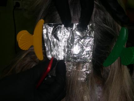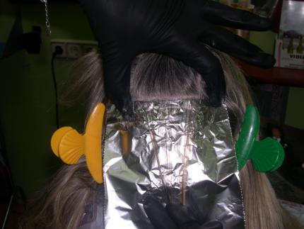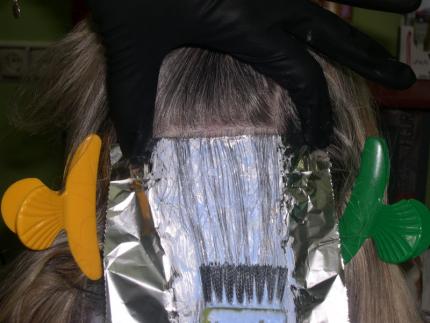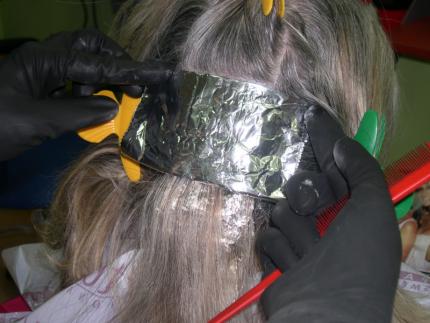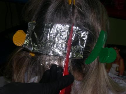 Lo que hago es poner primero la pasta en la mitad del papel (y de las mechas) luego me voy a la raíz y estiro fuerte para que quede bien estirada la mecha y luego la dueblo hacia arriba desde la punta, y lo cierro bien fuerte con los dedos y después le hago otro dobletre por los lados con el peine, para que quede bien sujeto.