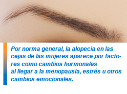 Por norma general, la alopecia en las cejas de las mujeres aparece por factores como cambios hormonales al llegar a la menopausia, estrés u otros cambios emocionales, una depilación demasiado constante, como resultado de un tratamiento médico como el del cáncer, o por un trastorno obsesivo como la tricotilomanía, que las lleva a arrancarse el vello de manera compulsiva.