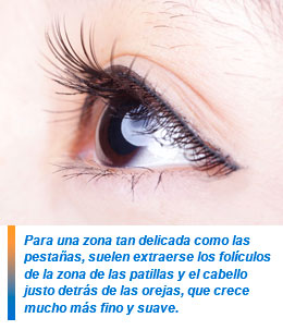 Para una zona tan delicada como las pestañas, suelen extraerse los folículos de la zona de las patillas y el cabello justo detrás de las orejas, que crece mucho más fino y suave. Al colocar los folículos en la línea del párpado, gracias al instrumental especial, se logra dejarlos con la raíz girada, con lo que se consigue que el nuevo pelo crezca con la curvatura hacia arriba más natural.