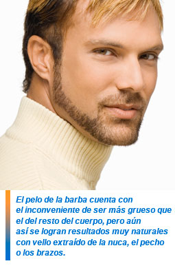 El pelo de la barba cuenta con el inconveniente de ser más grueso que el del resto del cuerpo, pero aún así se logran resultados muy naturales con vello extraído de la nuca, el pecho o los brazos. Una intervención de este tipo dura alrededor de las siete horas, dependiendo de la magnitud del área a tratar, pero la nueva barba resultante, pasados tres meses, se comporta como una barba normal e incluso se puede afeitar de manera habitual, si bien mantendrá el ritmo de crecimiento de la zona de origen.