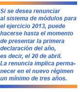➔ Si se desea renunciar al sistema de módulos para el ejercicio 2013, puede hacerse hasta el momento de presentar la primera declaración del año, es decir, el 20 de abril. La renuncia implica permanecer en el nuevo régimen un mínimo de tres años.