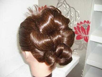 hola yo tengo mi tecnica y es muy sencilla , peinas todo el cabello para el lado que quieras pones laca y un gancho en la parte de abajo , con un giro de muñeca lo subes y ahuecas , vas poniendo ganchos y fijador ,terminandolo escondiendo las puntas.