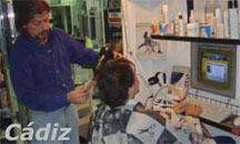 Arriba, imagen de esta ciberpeluquería en el Puerto de Santa María. Izda.: Manuel Muñoz peina a un cliente mientras éste disfruta cómodamente del acceso a internet, consultando distintas páginas. |