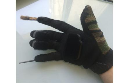 En ocasiones cuando aplico color me veo sosteniendo con la misma mano varios utensilios, el peine de púa que sostengo entre los dedos anular y meñique y que jamás suelto (siempre esta ahí), la paletina, el machete (llamo así al peine de desenredar)y en ocasiones también el pulverizador de agua (para coger este último tengo que soltar la paletina), así que me encuentro con tres herramientas en mi mano derecha y me manejo muy bien con ellas pero cuando vi los guantes al lado de las esponjas pensé: ¿Cómo sería trabajar sin ninguna herramienta?, ¿y si solo utilizásemos nuestras manos? ¿Cómo puedo combinar varios de estos elementos en una mano como si fuese una segunda piel?Me puse a ello, ideé un despropósito y en un guante incorporé una púa, un pincel y tres esponjas, hice varios ensayos hasta dar con la configuración mas cómoda y al fin lo tenia, a primera vista es feo, muy feo pero lo lleve al día siguiente a la peluquería ansioso por probarlo y le pedí a una compañera que me dejara teñirla.