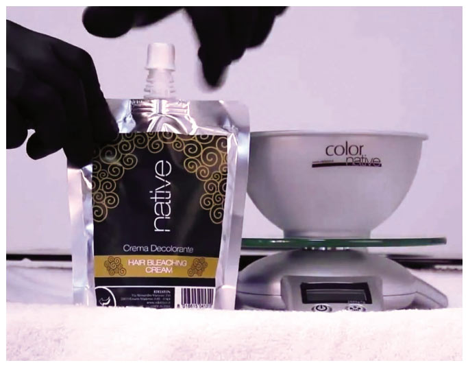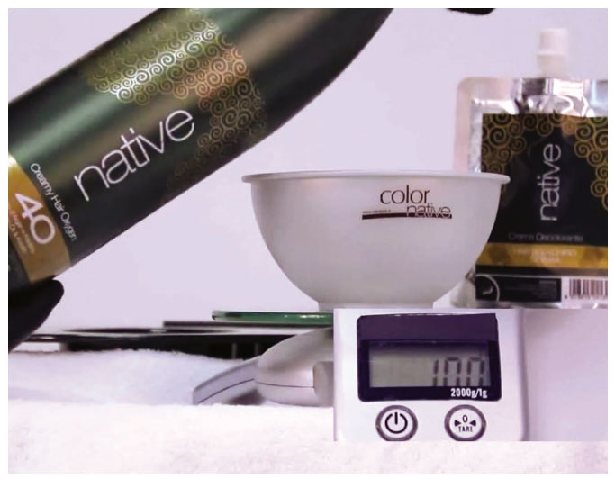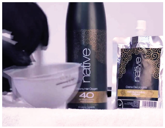 - Se mezclan 50 gramos de crema decolorante Native con 100 gramos de oxidante de 40 volúmenes de la misma firma.