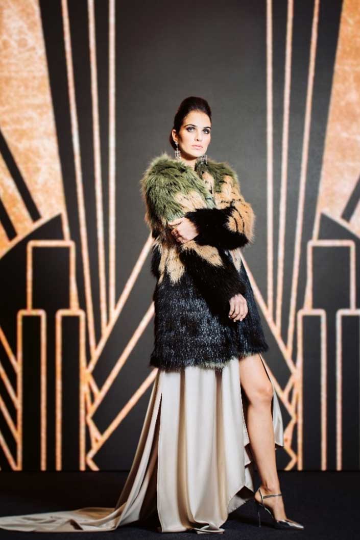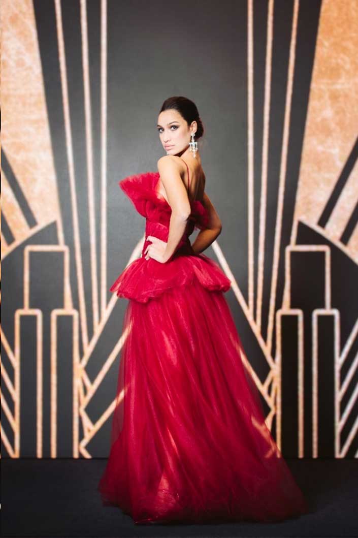 El reconocidísimo diseñador canario Pedro Palmas, es uno de los participantes con la presentación de su Art Déco, caracterizada por volúmenes, superposiciones de tejidos, tules bordados, semitransparencias y largos maxis en los vestidos que crean la sensación de estelas.