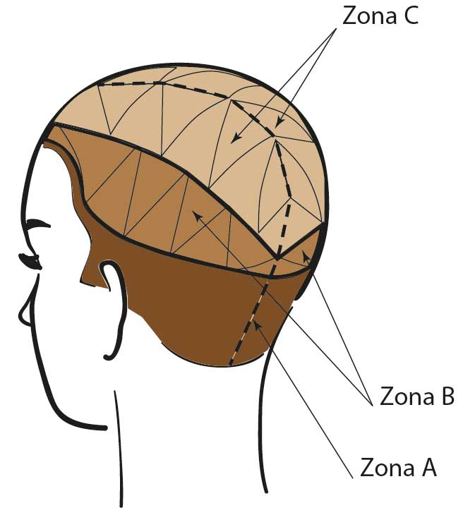 Sobre las longitudes de la parte superior del zig-zag, aplicar Carmen 7*13 y después recubrir con celofán. - 4. Dividir la parte superior de la cabeza, zona C, en dos, partiendo desde el inicio de la raya, hasta la mitad del vértice. Dividir de nuevo cada una de las zonas por un zig-zag y repetir la técnica de aplicación sobre las longitudes con Solaris Poudr6 y Carmen 8*13.