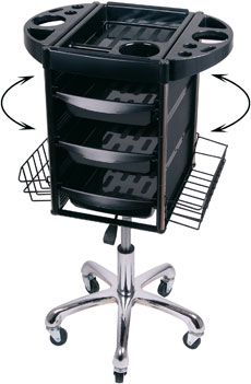 Consta de tres bandejas y dos botelleros laterales, aparte de la bandeja superior y soportes laterales abatibles, con espacio para bol, secador, paletinas, peines, cepillos, etc.