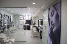 El último salón de la firma Rizos Peluqueros, con su renovada imagen corporativa, está situado en la c/ José Ortega y Gasset, 65, de Madrid. Desde la calle se vislumbra una majestuosa fachada de doble altura, la cual nos introduce a un espectacular hall de distribución que nos recibe y nos da la bienvenida.