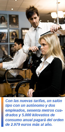 Por lo tanto, un salón tipo con un autónomo y dos empleados, sesenta metros cuadrados y 5.000 kilovatios de consumo anual pagará del orden de 2.979 euros más al año.