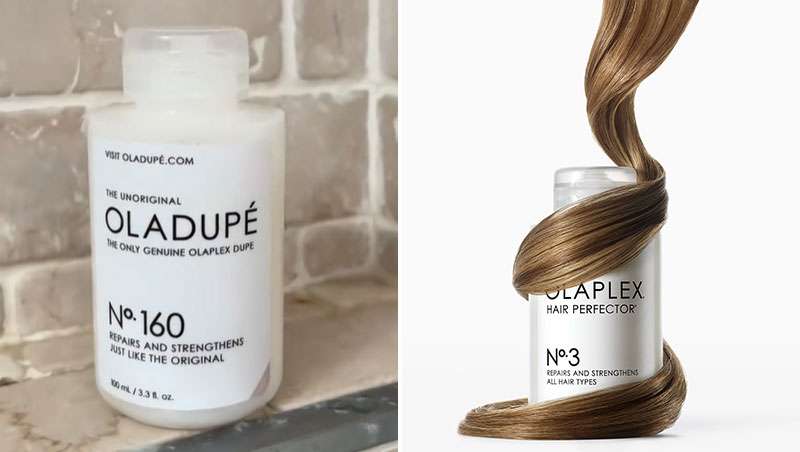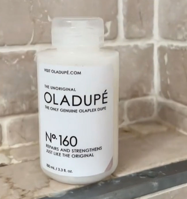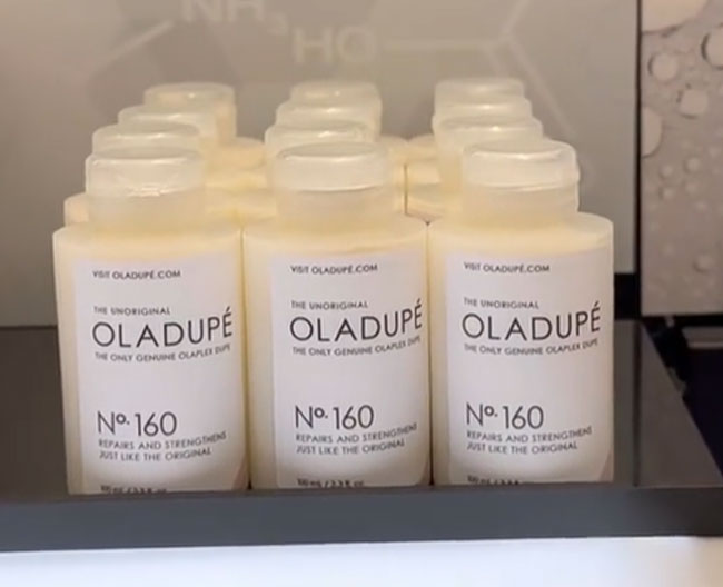 Oladupé, que tiene por lema, "El único duplicado genuino de Olaplex", se empaquetó de manera similar al popular Hair Perfector de Olaplex, pero con el número 160 impreso en la etiqueta en lugar del número 3.
