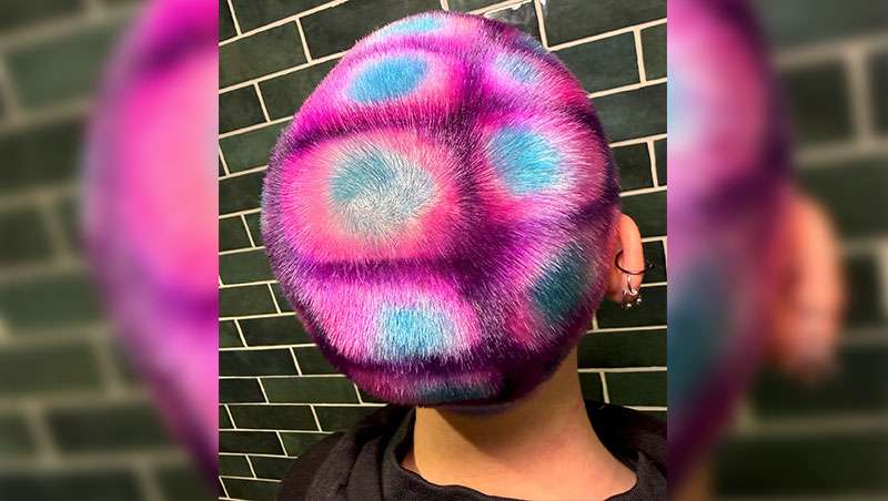 Para este look, el proceso comenzó preaclarando la base del cabello hasta alcanzar un nivel 10 limpio, creando así el lienzo ideal para el diseño. Con pinceles finos se trabajó el motivo a mano, iniciando desde el centro y avanzando hacia los lados para mantener el equilibrio y la simetría. Primero se aplicó la capa de rosa, que se dejó procesar completamente para fijar su intensidad; después se aclaró suavemente antes de pasar a la siguiente fase. A continuación, se incorporó el tono púrpura, nuevamente utilizando pinceles finos para definir las líneas. Los dedos se emplearon como herramienta de difuminado sobre el patrón, añadiendo una pequeña cantidad de rosa y suavizándolo para crear un efecto de sombra en las esquinas. Para lograr que el diseño destacara aún más, se añadió un color turquesa en los centros del dibujo, fundiéndolo de nuevo con el rosa mediante los dedos para mantener transiciones suaves y naturales.