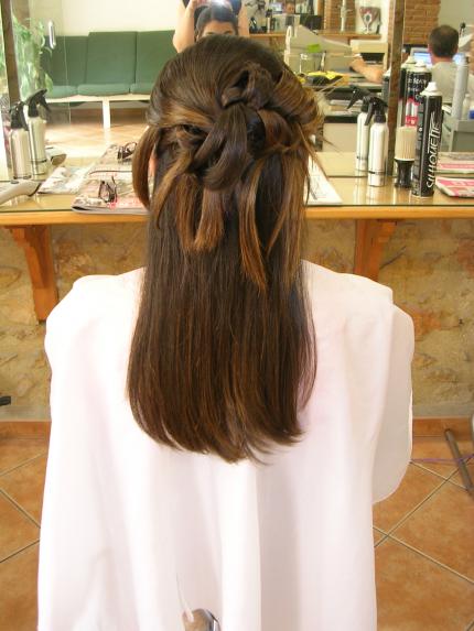 No hubo manera de convencerla de que se dejase el pelo suelto ni de recojerselo todo, ella estaba empeñada en...lo que le hice pero, salió contenta que es lo que importa! Yo sólo pensaba en que nadie le preguntase donde se habia peinado!!!