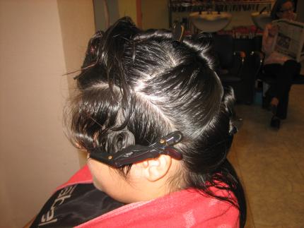 en el lateral mas recto..aprovecho el lado para unirlo con un mechon de cabello...