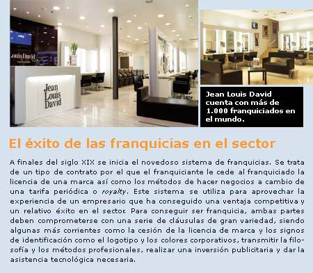 P.P.: En primer lugar observarán que se encuentran en salones modernos donde hallarán todo aquello que deseen, además de equipos formados para ofrecer lo mejor de la franquicia. Podrán informarse de las dos colecciones que anualmente Jean Louis David lanza y, por supuesto, estará siempre relacionada con las evoluciones de la moda. Acceder a nuestros salones supone recibir servicios exclusivos que la marca ofrece a sus clientes y, sobre todo, muchísima higiene, ya que utilizamos peinadores y toallas desechables desde hace más de 10 años, desinfectando cada peine o cepillo que se utiliza, empaquetándose todo el material en bolsas individuales.